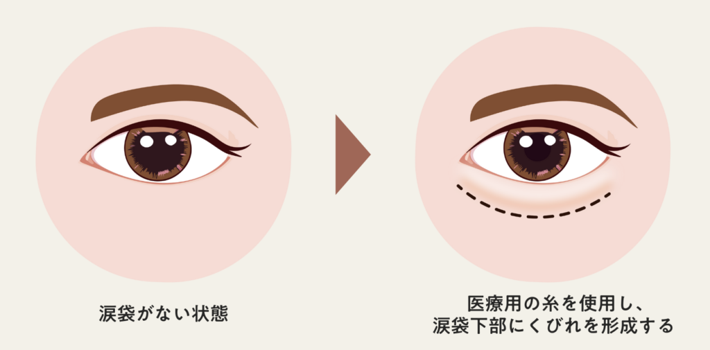 切らない涙袋形成術とは、下瞼の裏側にある結膜を5〜7mm程度切開し、涙袋の靭帯と筋肉を縫縮し、高まりを形成することで涙袋を作る手術です。従来のようにヒアルロン酸を注入するだけではなく、「涙袋が自然に見える構造」そのものを作り出すことで、ナチュラルで持続力のある涙袋を形成できます。縫縮方法は当院で考案した特殊な縫い方で、通常の二重埋没のような固定方法では外れてしまいます。一方で修正も容易にできるのがメリットでもあります。傷は針穴程度で、ダウンタイムの少ない施術です。