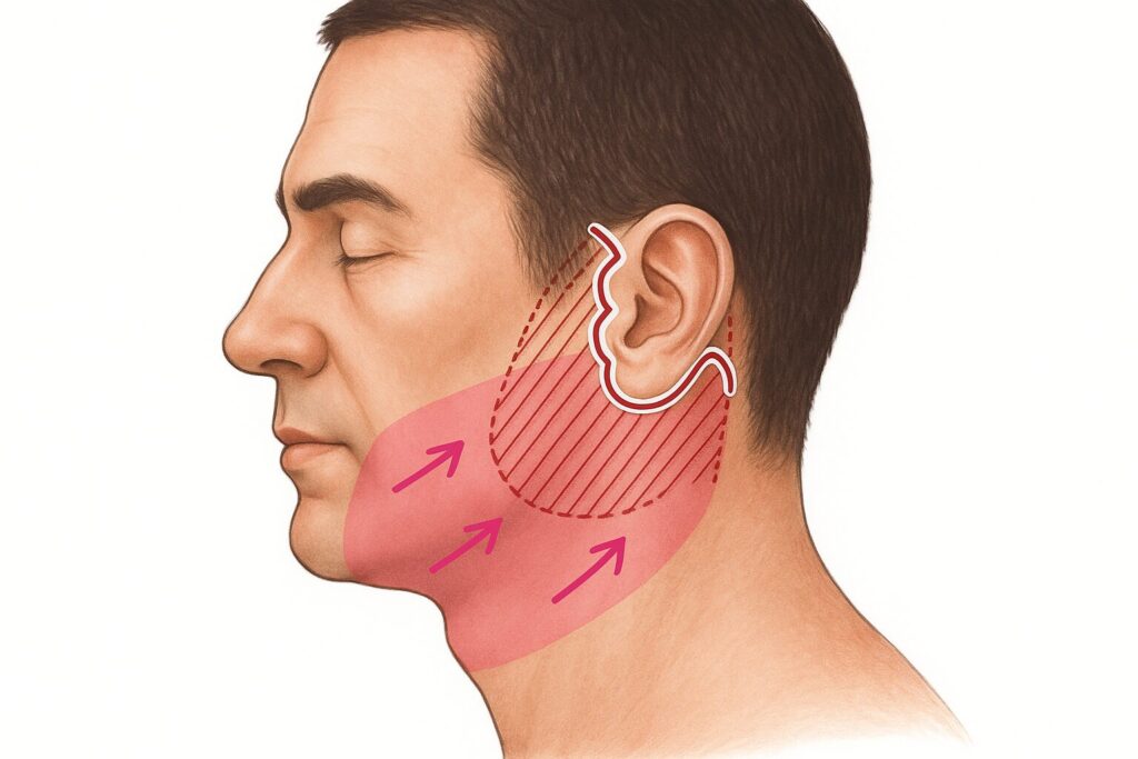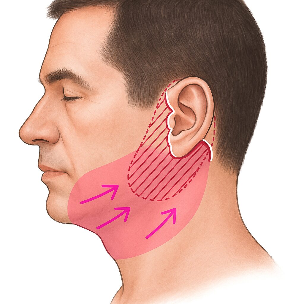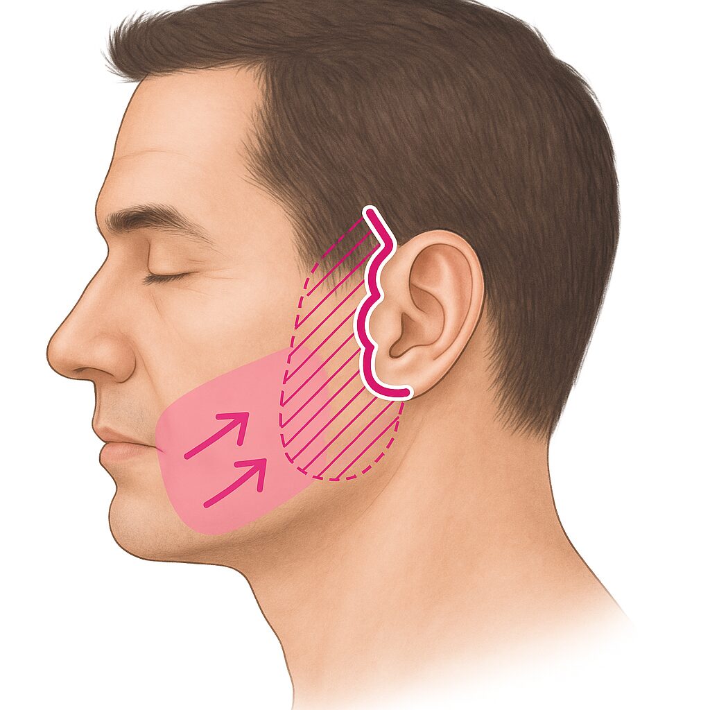 中顔面+下顔面リフトでは、法令線の下部からフェイスラインのあたり(図のピンクの部分)をリフトアップさせます。