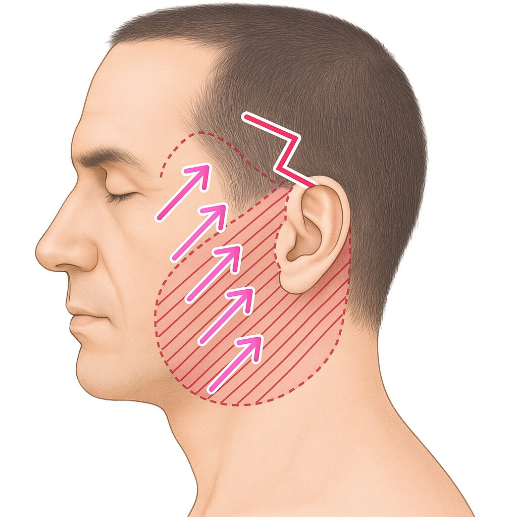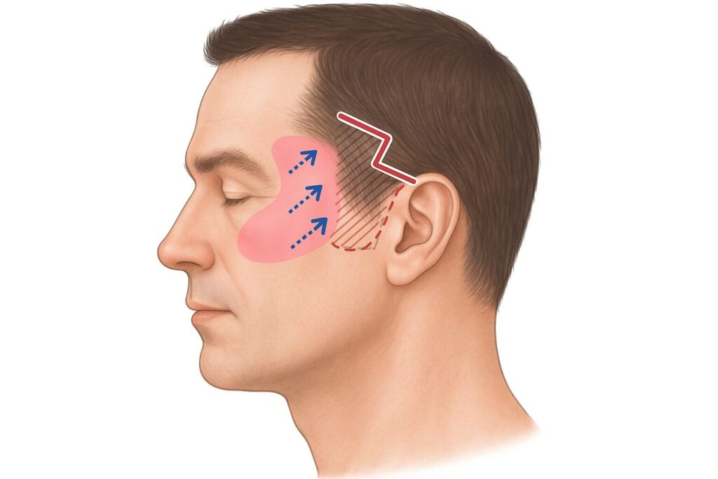 こめかみリフトでは、側頭部の毛髪の中を階段状に数cm切開し(図の赤線)、外側上方に引き上げます。