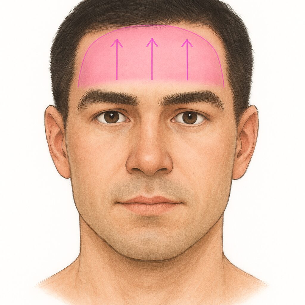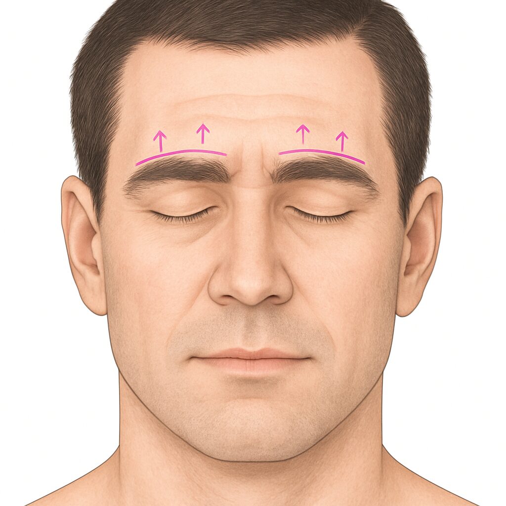 前額リフトはいわゆる“おでこ”(毛髪の生え際から眉上まで)のたるみの改善と、眉毛のリフトアップ効果があります。