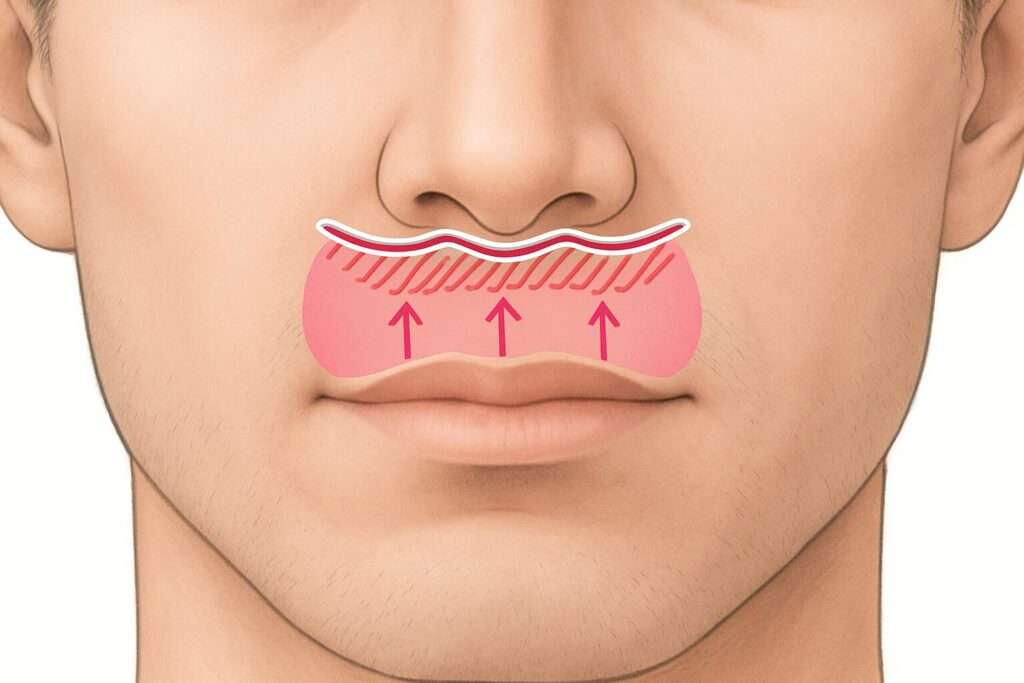 手術は鼻下から3〜8mmほどの皮膚と口輪筋の一部を切除し(図の赤線)、後戻りしないように口輪筋を骨膜という硬い部分に縫合します。