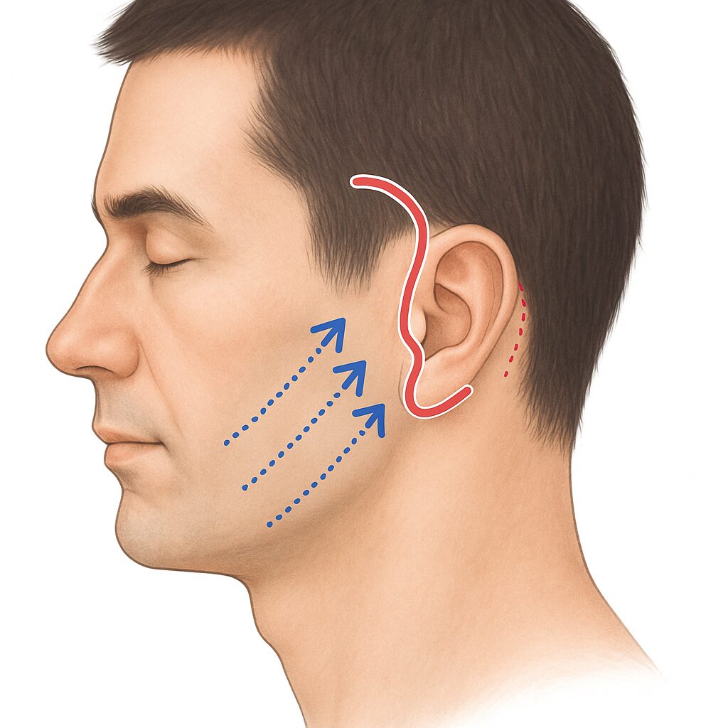 耳前から耳裏まで(図の赤線)を切開し、たるみを引き上げる手術です。